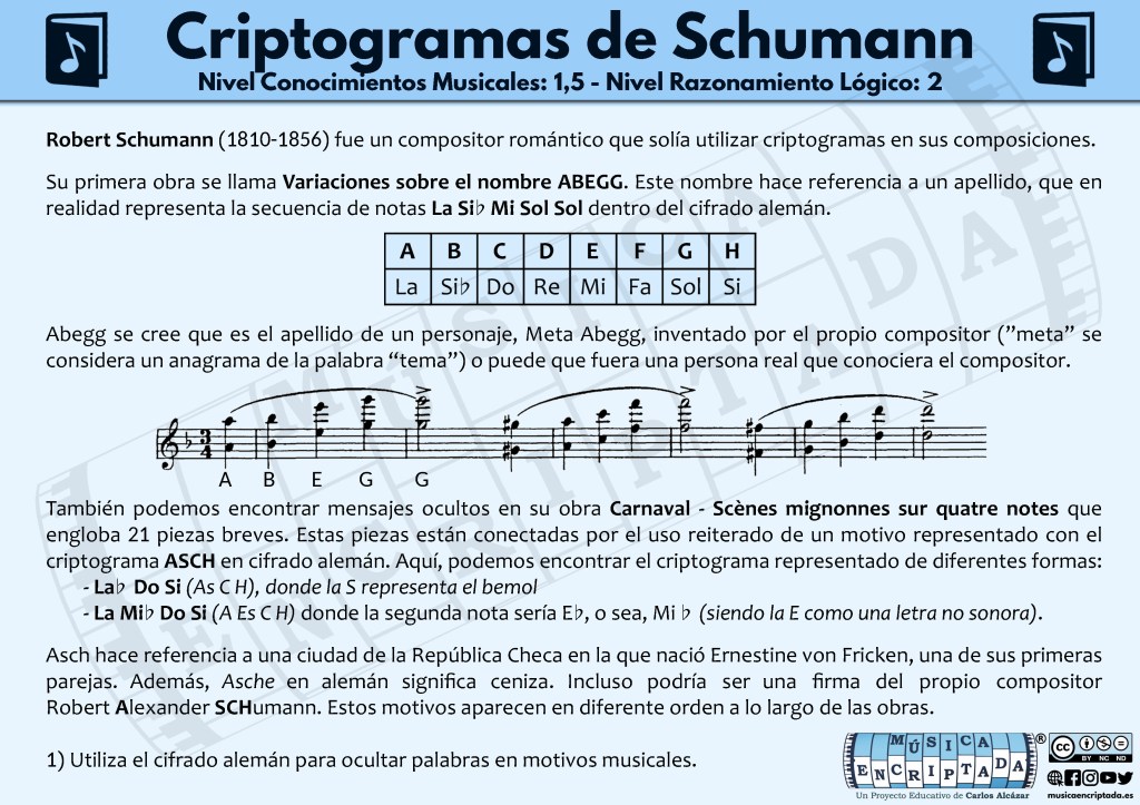 Desencriptando, Recursos EducativosCriptogramas de Schumann 16 May 202217 Ago 2025 Música Encriptada Robert Schumann fue un compositor que solía utilizar criptogramas en sus composiciones. Así ocurre en las «Variaciones sobre el nombre ABEGG» y también en la obra Carnaval donde ocultaba la palabra ASCH. Pulsa para ampliar la imagen enlace enlace Bajo licencia Creative Commons BY-NC-ND