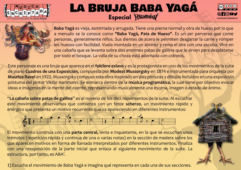 Desencriptando, Halloween, Recursos EducativosLa Bruja Baba Yagá (Halloween) 22 Oct 202311 Dic 2023 Música Encriptada Conoce a la bruja Baba Yagá, un ser horripilante que se alimenta de niños. Forma parte de la suite Cuadros de una Exposición de Modest Mussorgsky. Aquí tienes una guía de escucha. Pulsa para ampliar la imagen Bajo licencia Creative Commons BY-NC-ND