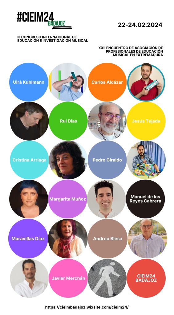 Los días del 22 al 24 de febrero de 2024 estaré en Badajoz participando como ponente en en el III Congreso Internacional de Educación e Investigación Musical (CIEIM) y XXI Encuentro de profesores de Educación Musical de Extremadura, donde participaré junto a grandes referentes en la pedagogía musical Uirá Kuhlmann, Margarita Muñoz o Pedro Giraldo. Será una gran experiencia organizada por APEMEX