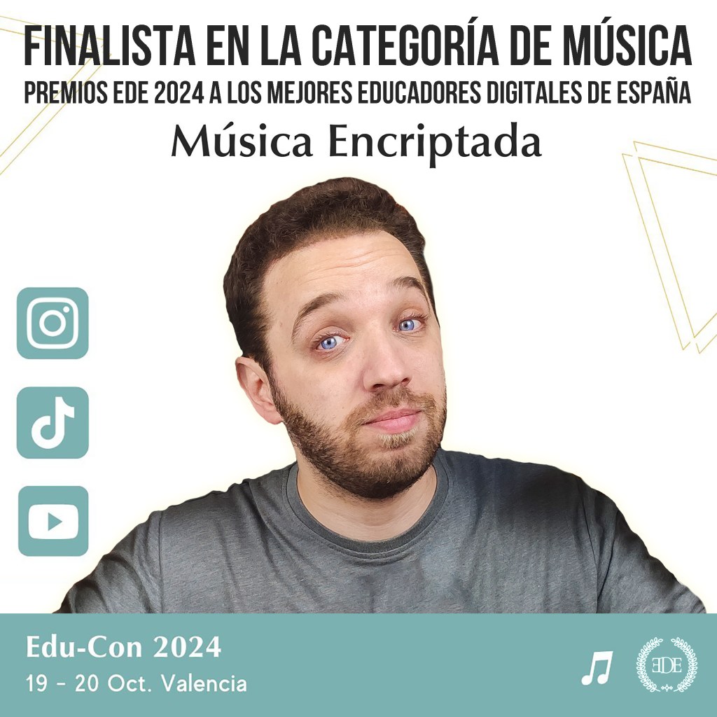 Estoy muy feliz con esta noticia que acabo de recibir: 🎖️Soy finalista a los PREMIOS EDE 2024 a los Mejores Educadores Digitales de España en la Categoría de Música. Los días 19 y 20 de octubre en Valencia se conocerán los ganadores. Gracias por el apoyo a mi proyecto desde el primer día 🤗🤗