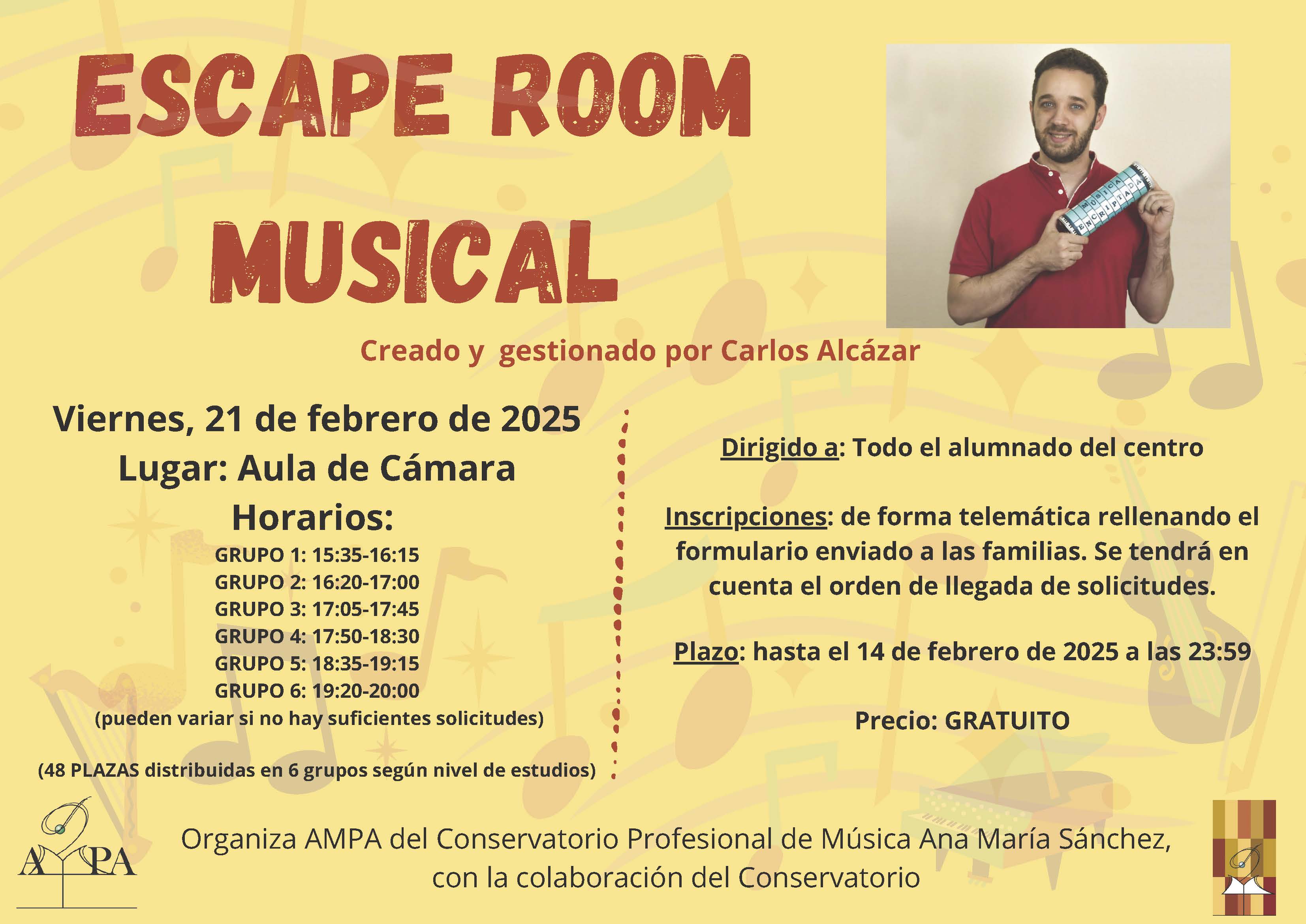 Comunidad Valenciana, Formación, Taller Educativo AlumnadoElda (Alicante): «Escape Room Musical» 30 Ene 202512 Abr 2025 Música Encriptada El próximo martes 21 de febrero realizaré una Escape Room Musical en el Conservatorio Profesional de Música de Elda (Alicante). Lo pasaremos en grande. información