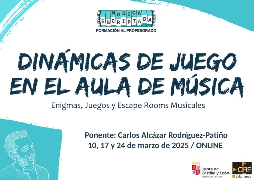 Castilla y León, Curso Online, FormaciónSalamanca: «Dinámicas de Juego en el Aula de Música» 21 Feb 202517 Ago 2025 Música Encriptada En el mes de marzo de 2025 impartiré una formación online sobre Juegos Musicales para el Centro de Profesorado de Salamanca. INFORMACIÓN