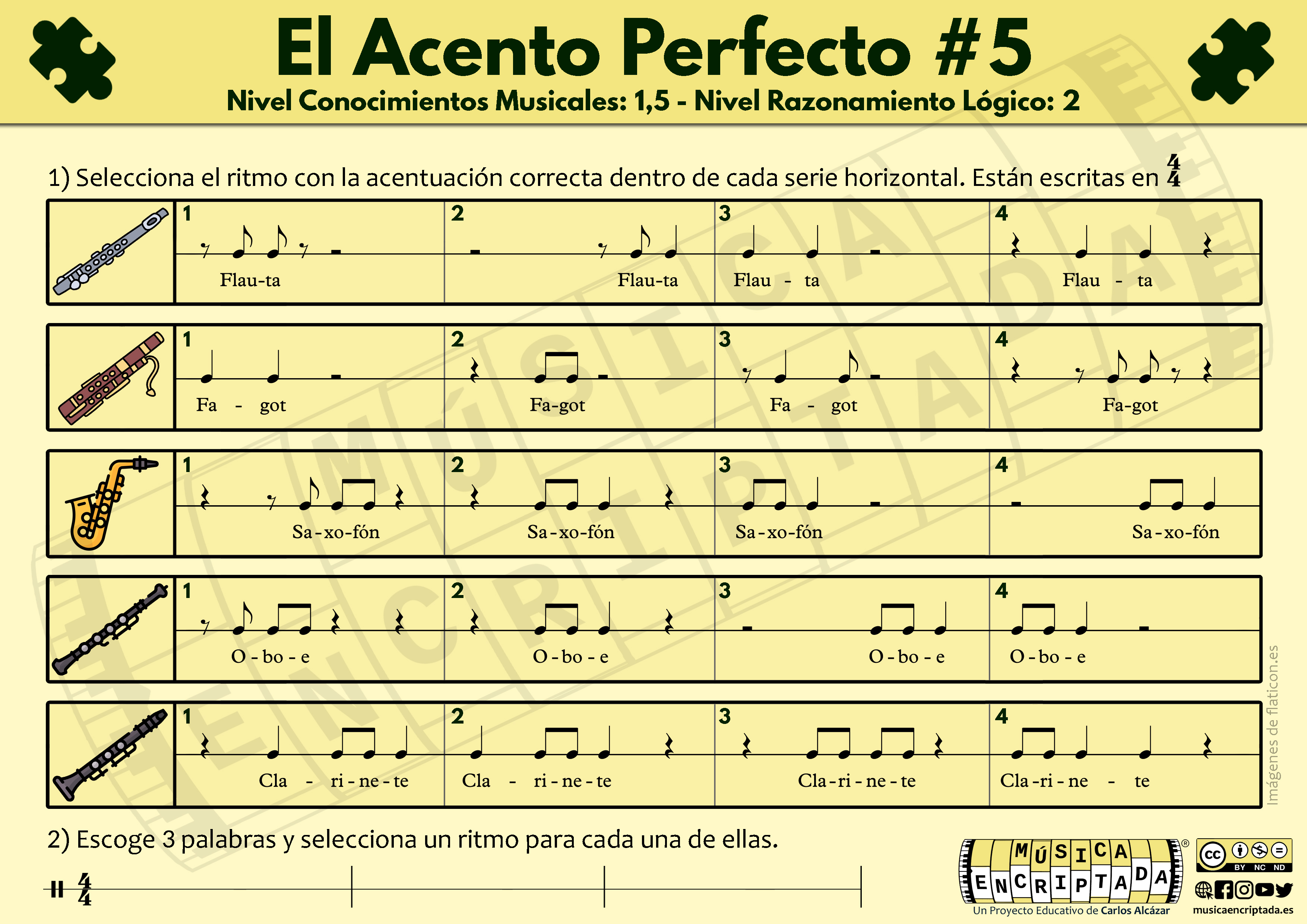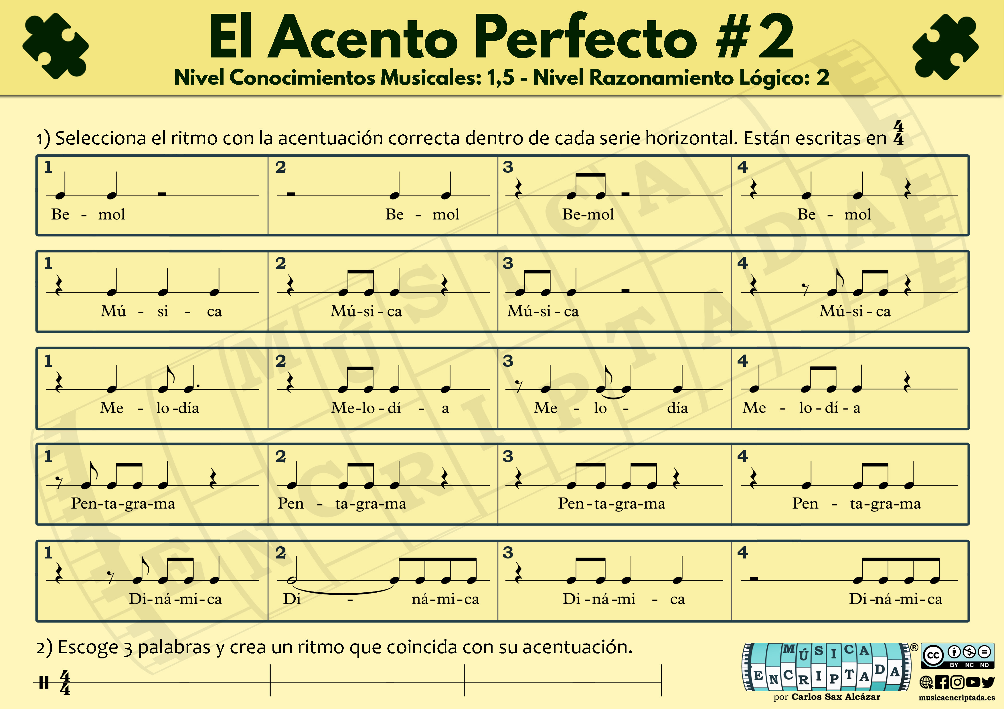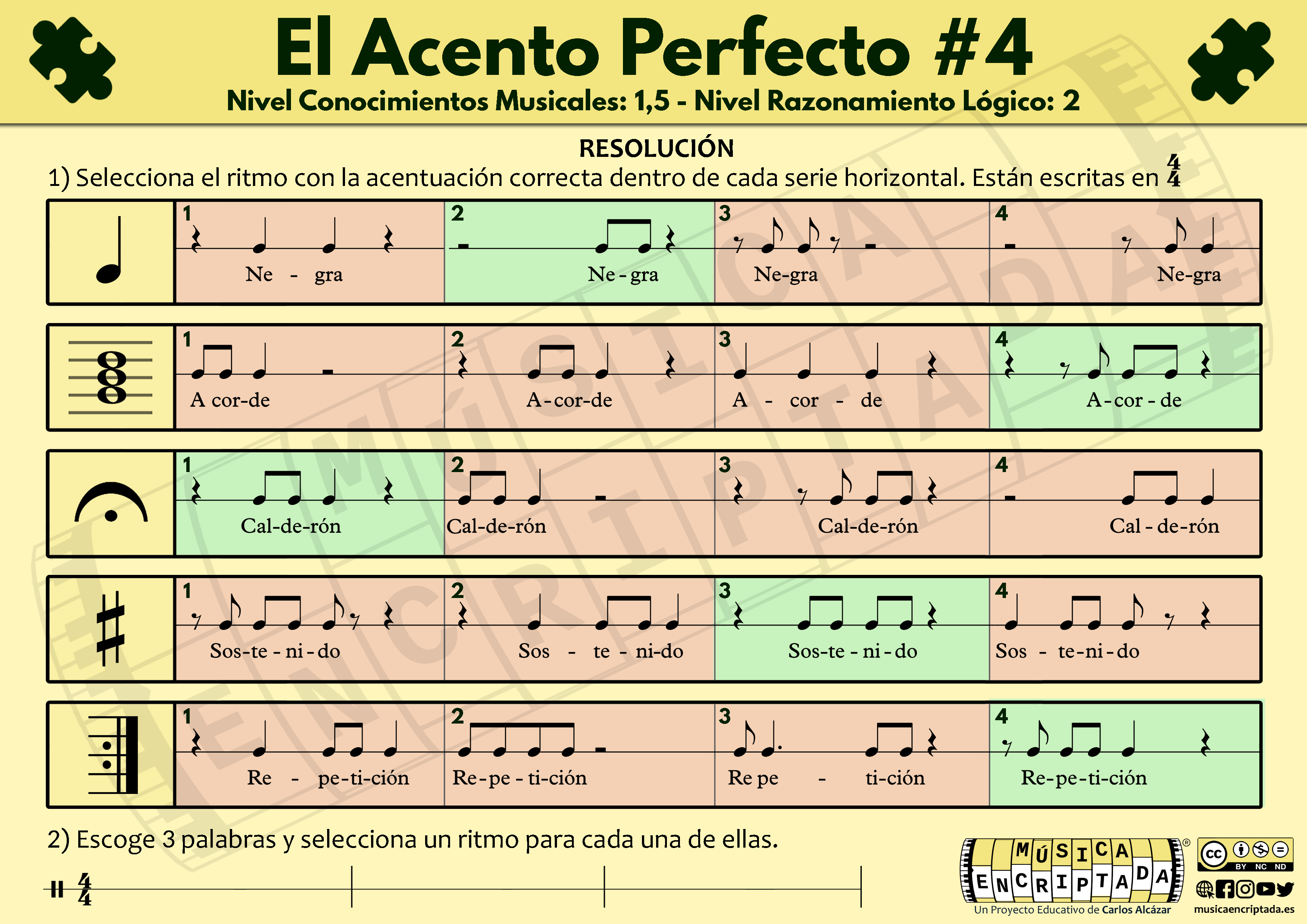 Aquí tenéis un nuevo enigma musical. Encuentra la acentuación correcta en la que la sonoridad de la palabra es la misma que la acentuación del compás, ¿serás capaz de resolverlo?