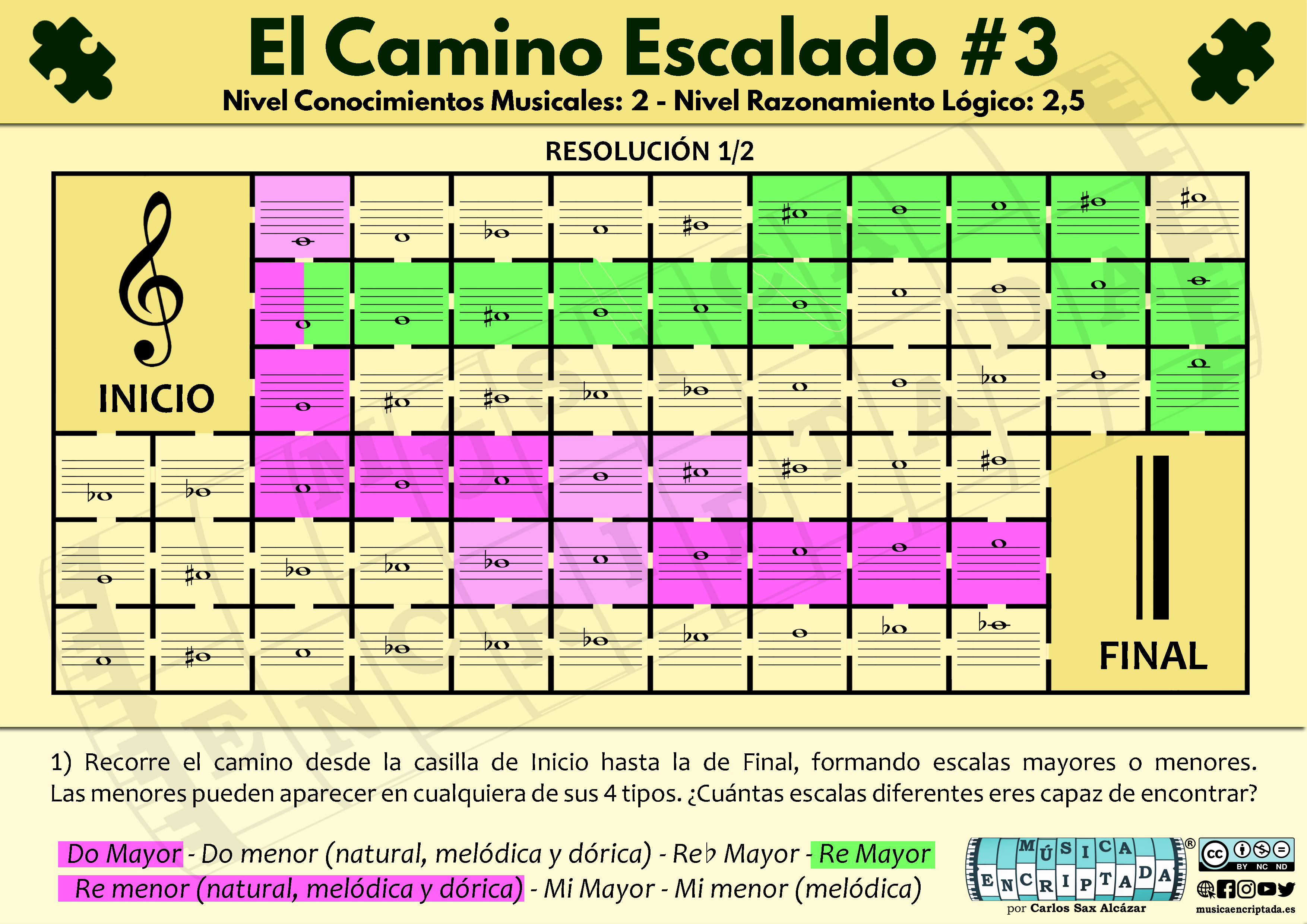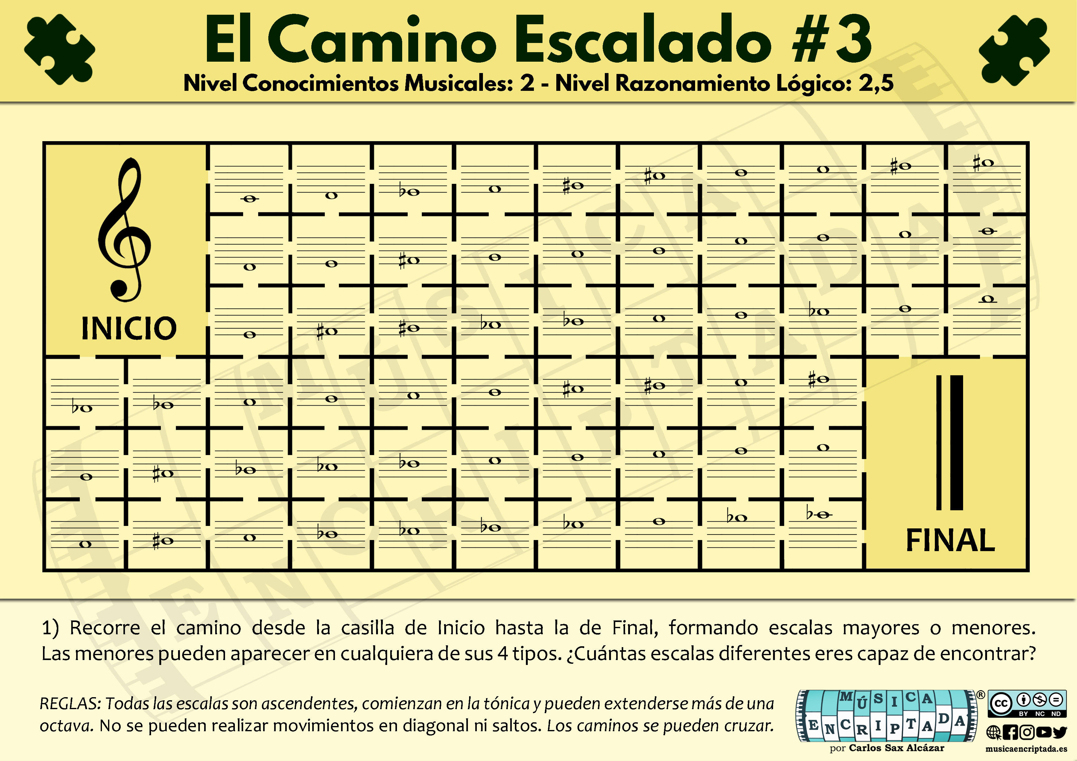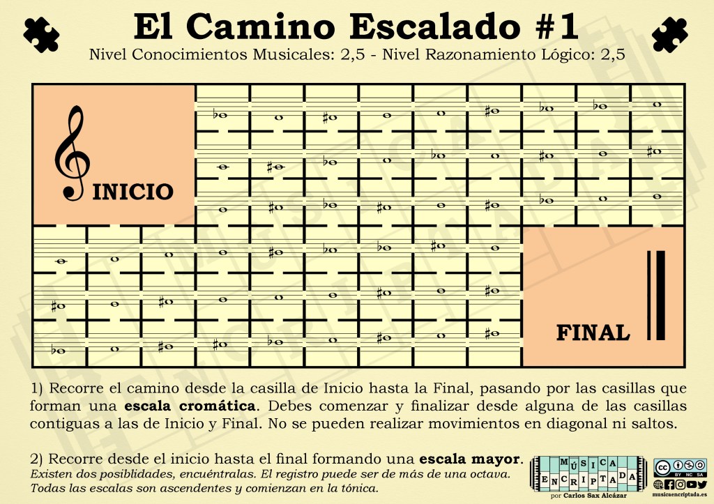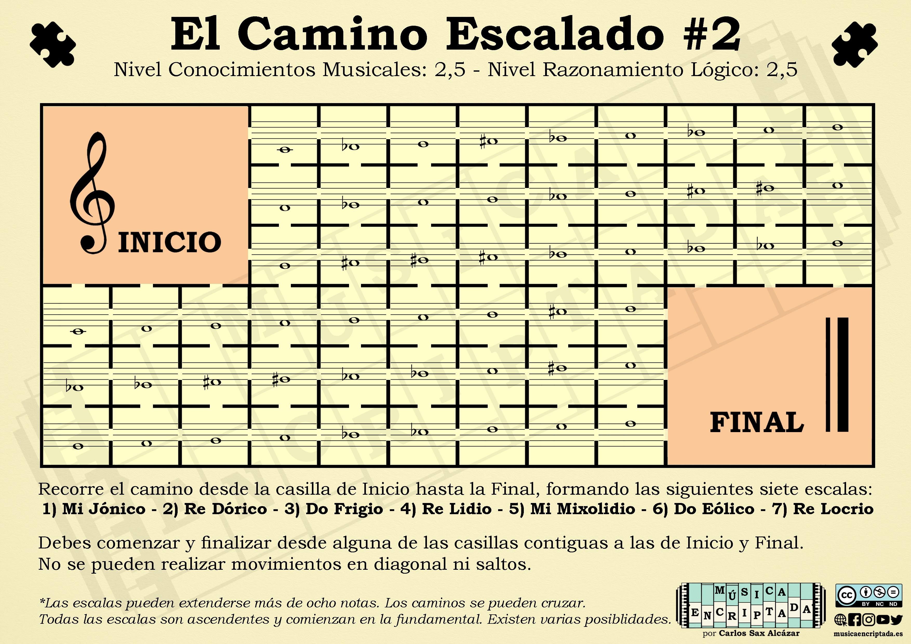 Camino Escalado, Enigmas MusicalesCamino Escalado 1 11 Nov 201923 Ago 2025 Música Encriptada ¿Eres capaz de llegar al final formando las escalas del ejercicio? Pulsa para ampliar la imagen solución Bajo licencia Creative Commons BY-NC-ND