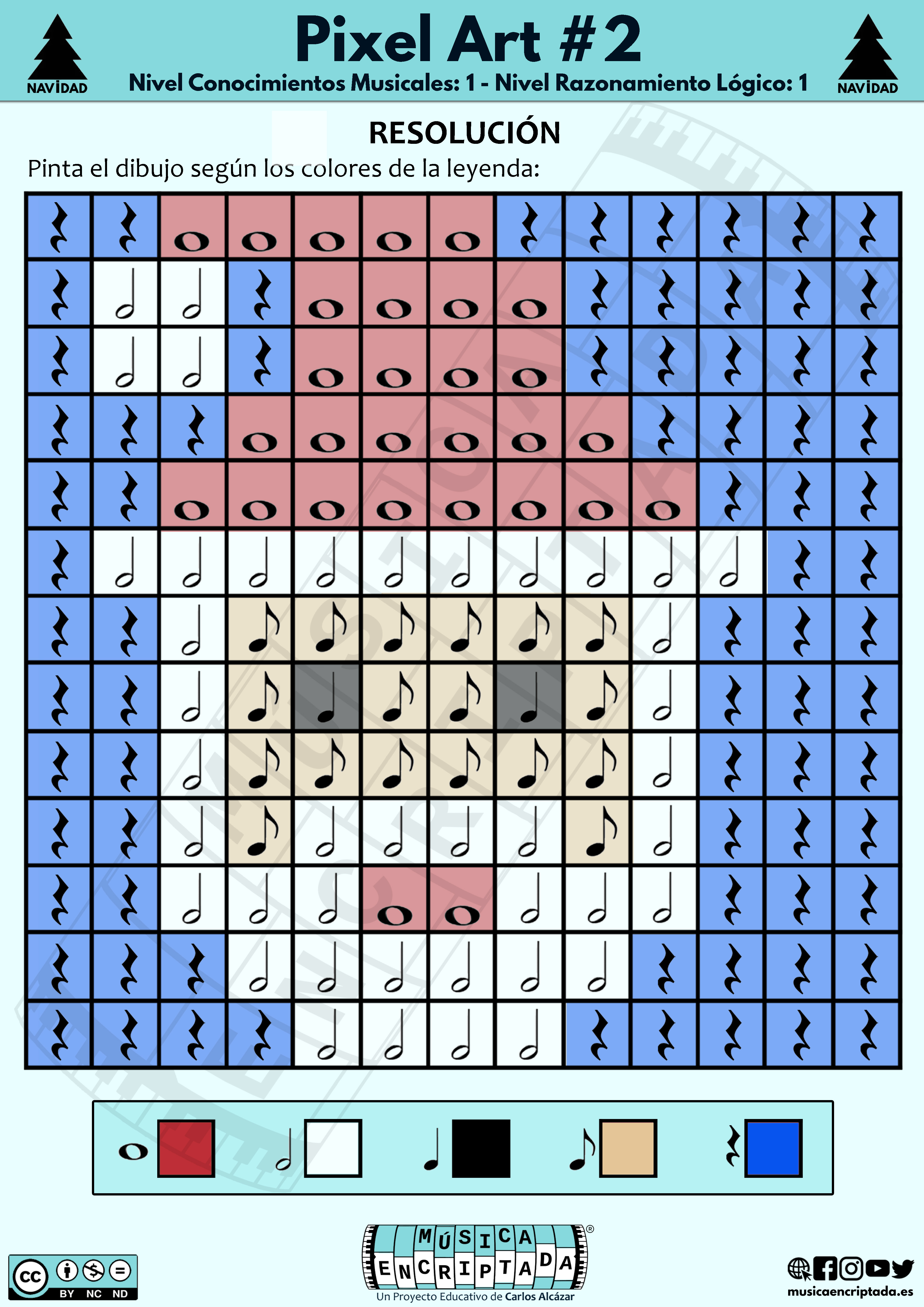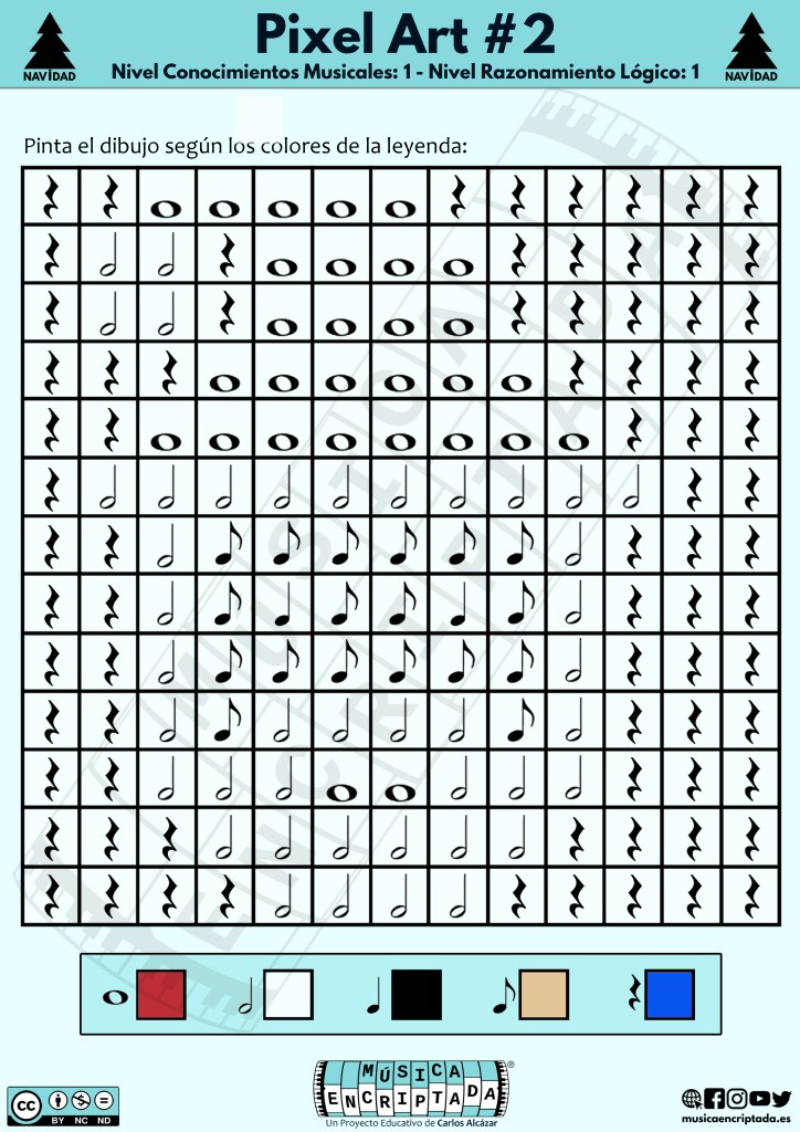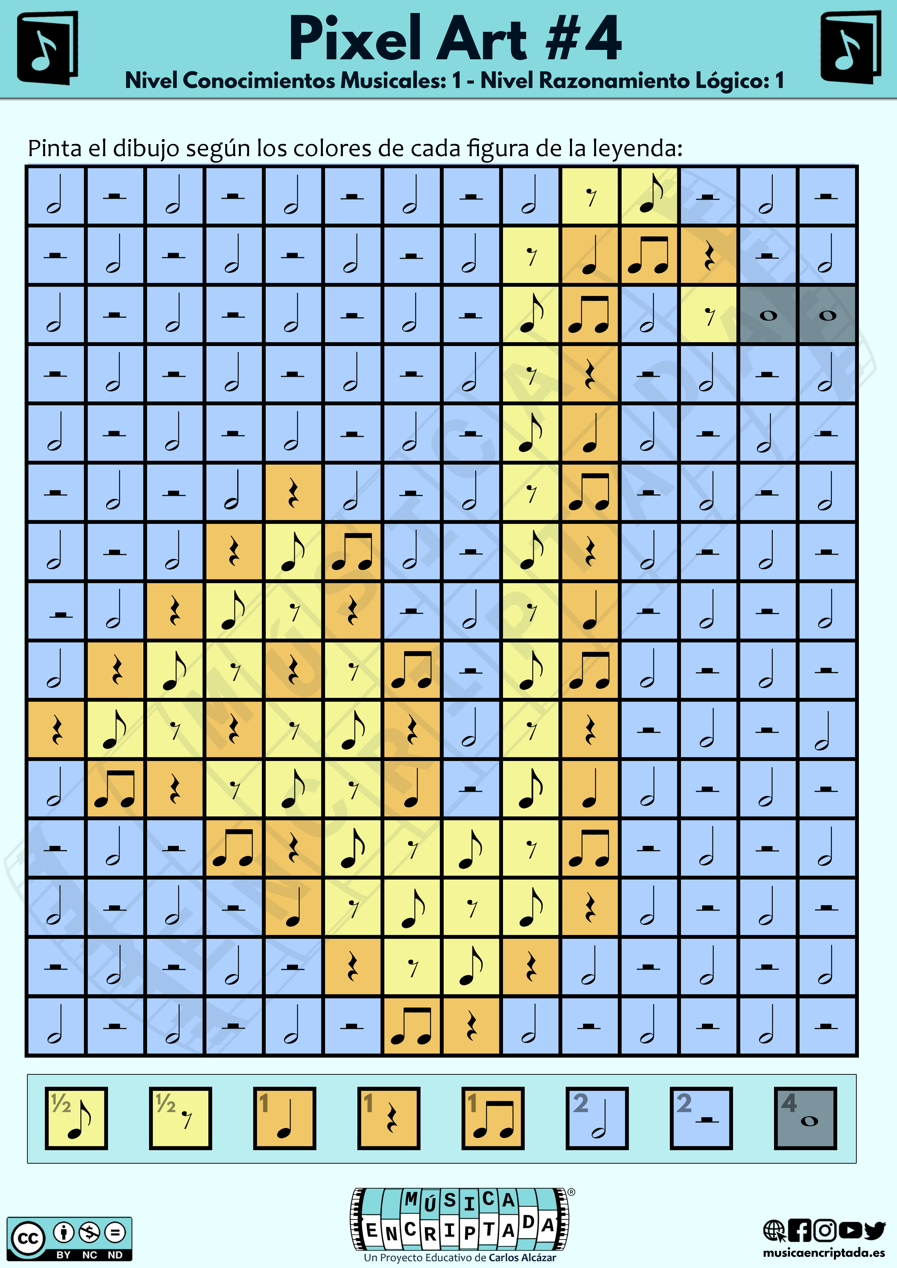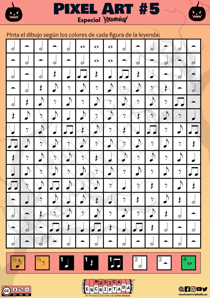 Pinta la imagen según los colores de las figuras musicales para obtener un dibujo en este Pixel Art Musical especial Halloween. Ideal para decorar la clase.