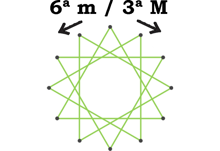¿Y si modificamos los vértices y en vez de colocar las notas de círculo de quintas colocamos las notas de la escala cromática? Pues todo seguiría igual, salvo los dodecágonos que estarían invertidos.