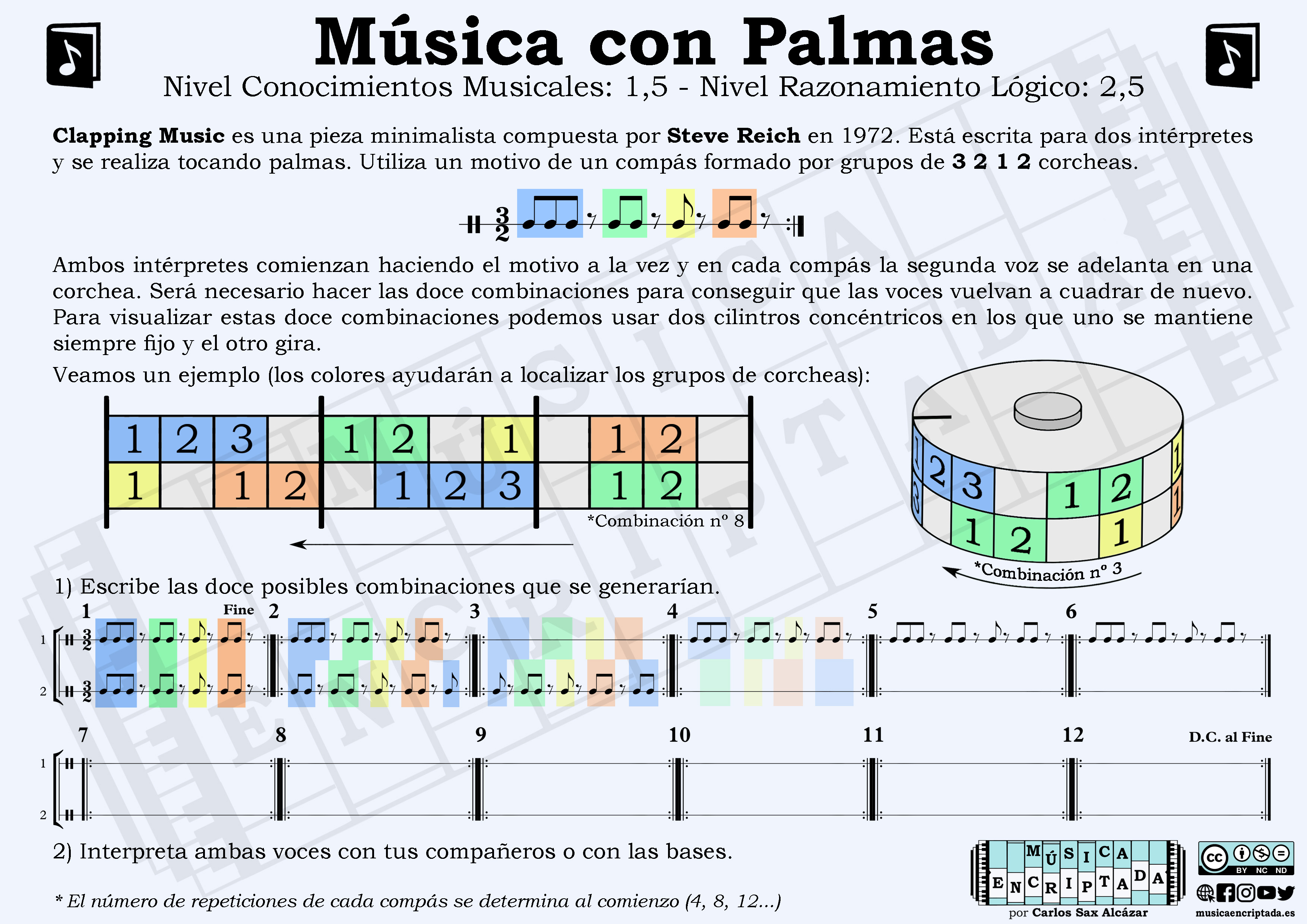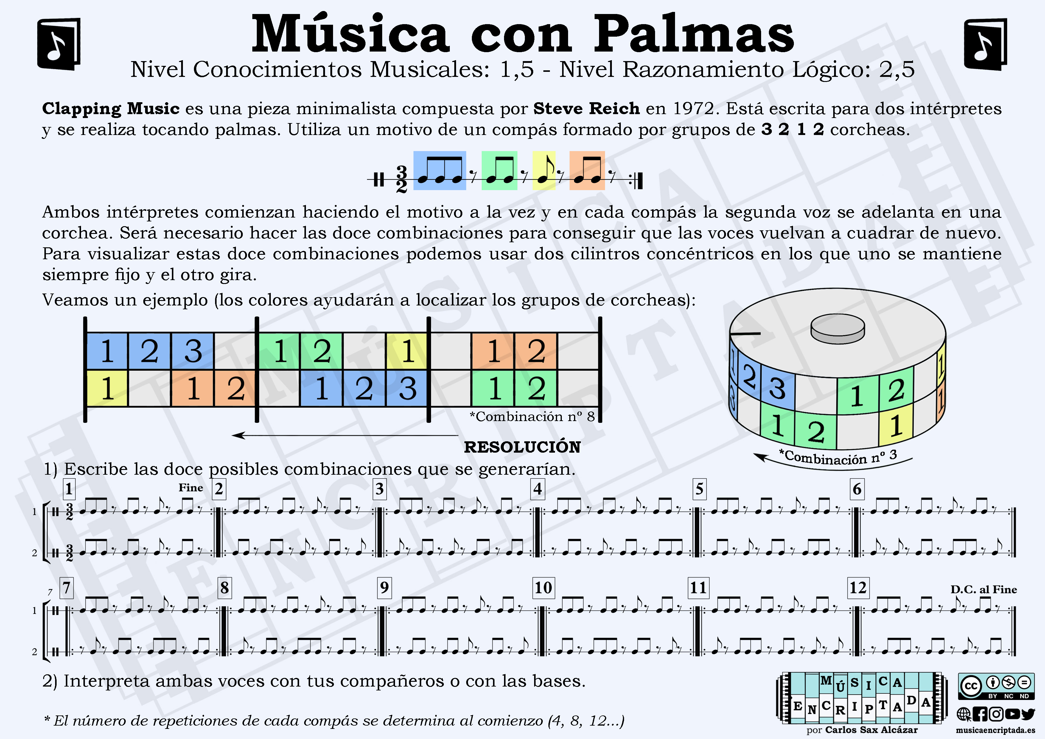 Conoce Clapping Music, una obra minimalista compuesta en 1972 por Steve Reich con la que podrás retar a tus amigos. Está escrita para dos intérpretes y se realiza tocando palmas con motivos 3 2 1 2 corcheas. Aquí tenéis bases para trabajarla en el aula de música ¿te atreves a jugar?