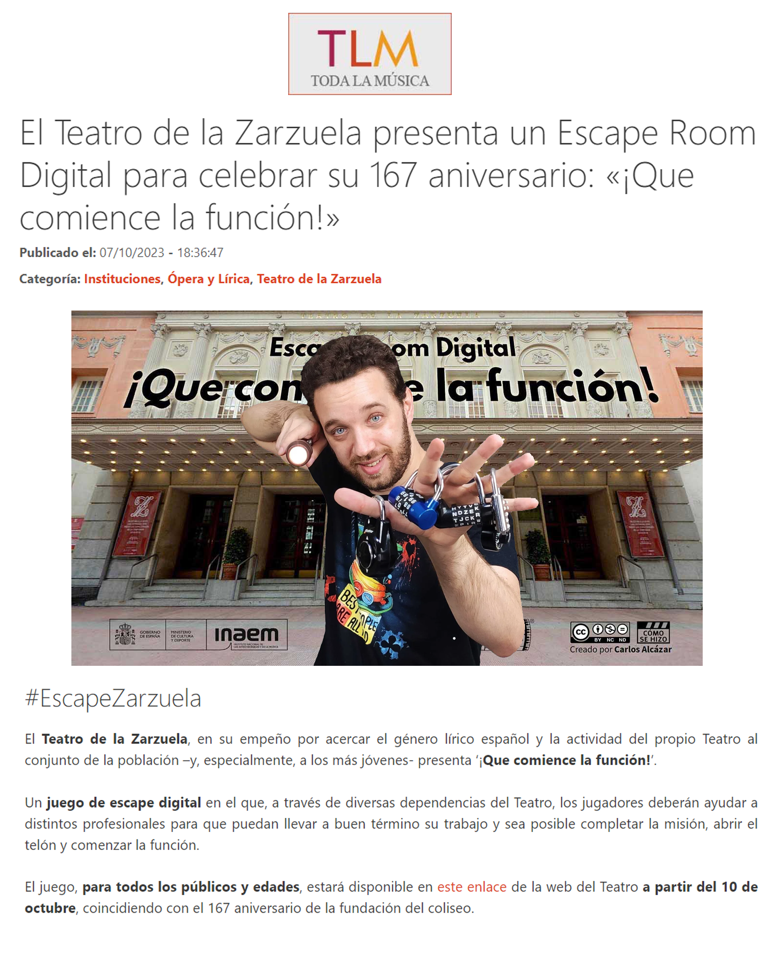El Escape Room en el Teatro de la Zarzuela ha sido protagonista de diarios nacionales y difundido por el mismísimo Ministerio de Cultura del Gobierno de España.